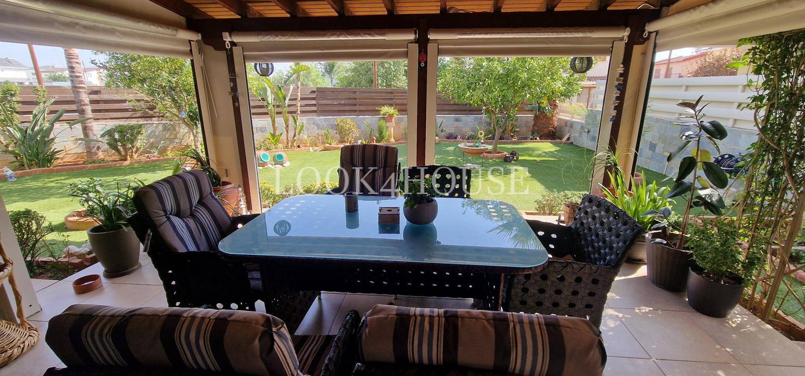 🌿 Beautifully designed pergola with tents, overlooking a serene garden