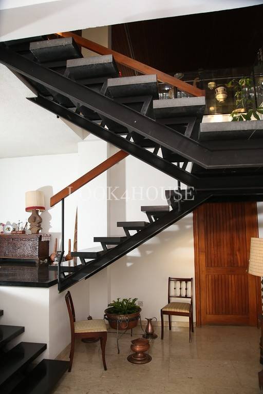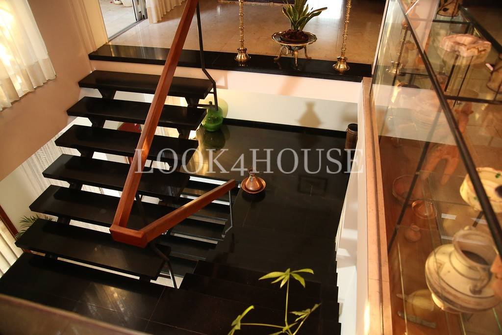 - Stylish open black granite staircase, travertine marble walls, teak ceilings, and marble flooring
