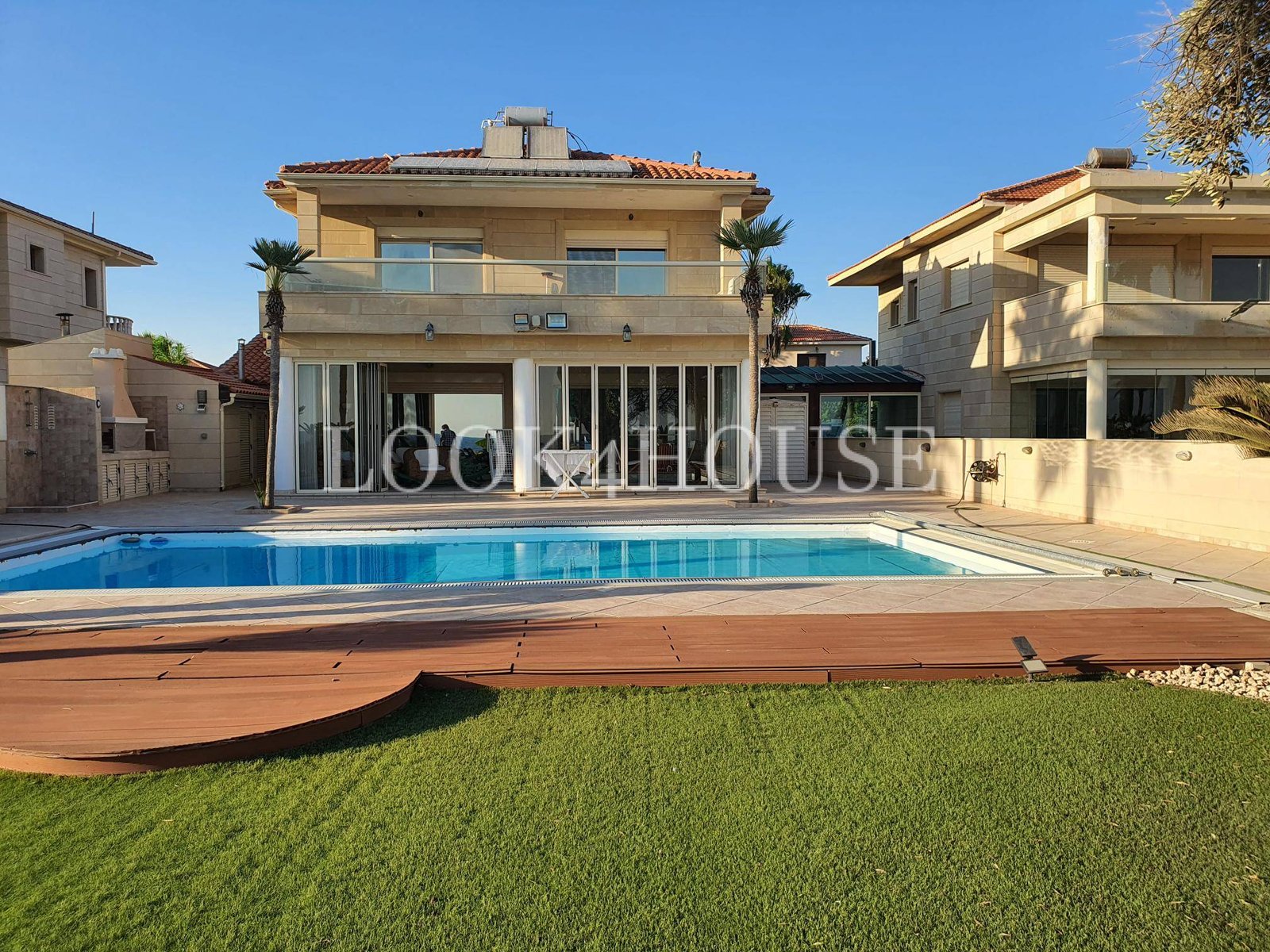 Sparkling private pool surrounded by lush grass and sunbathing areas
