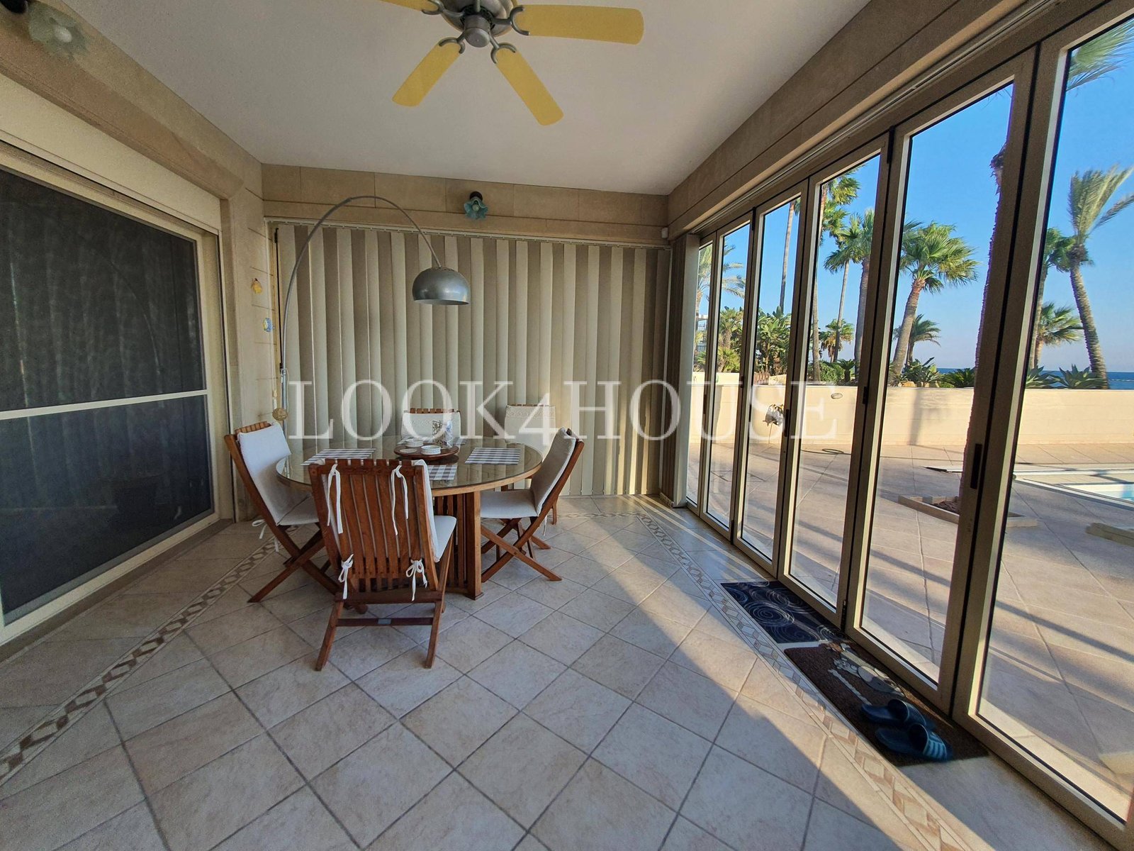 A welcoming sunroom overlooking the pool and garden